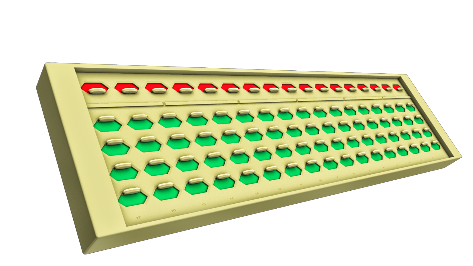 (sliders are like the beads in the convention abacus) The basic frame made of Quality polystyrene, which is a single integral piece, is chosen to be made in the “Yellowish Cream” colour, which is a very friendly background for the eyes to work with. The basic frame consists of the upper and lower window positions, which are separated by a slim rib (which can be also called the bar), hosting the home points, represented by a thick “DOTS”. The sliders could be moved up and down to display value & non value positions by uncovering and/or covering the colour images.